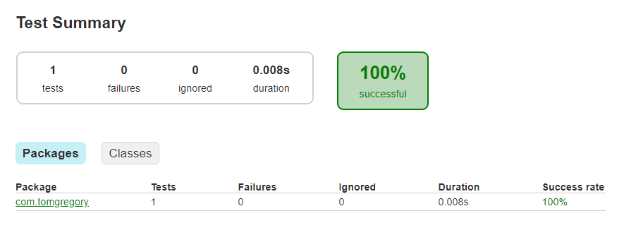 The test can be run by running ./gradlew test. In build/reports/tests/index.html you'll see this report showing that the test passed: