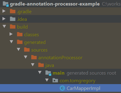 We can see the generated CarMapperImpl class in build/generated/sources/annotationProcessor then java/main/com/tomgregory: