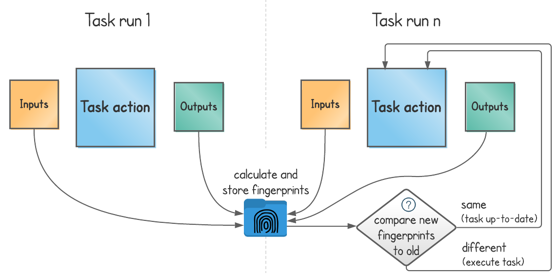 If all inputs and all outputs of a task have the same fingerprint as the last execution, the task can be skipped. Or in Gradle terminology the task is marked as UP-TO-DATE.