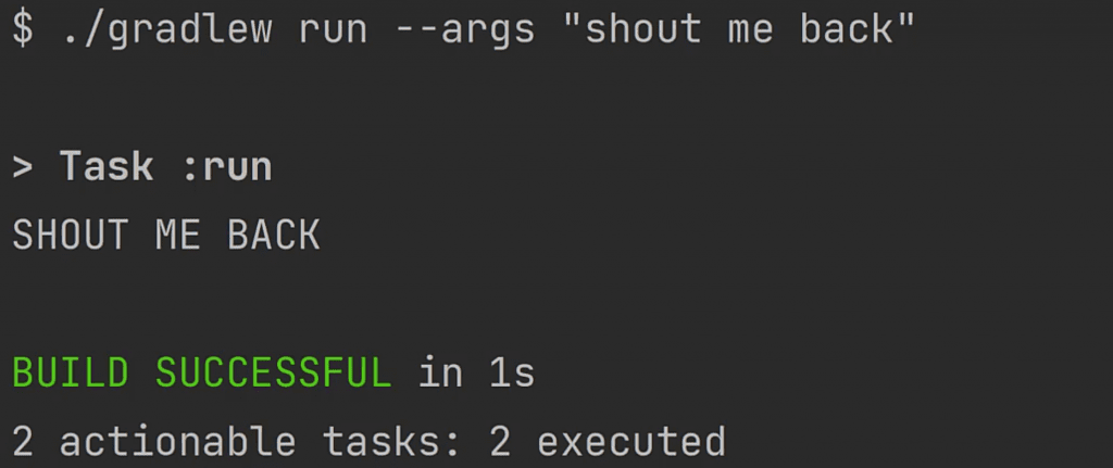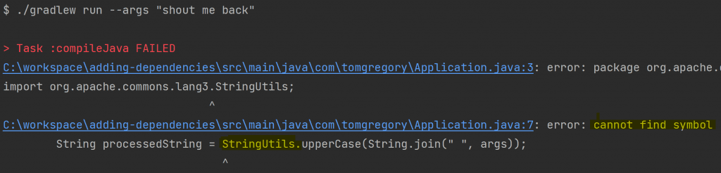 It shows that indeed our compile and runtime classpaths now contain commons-lang3. That means Gradle is able to compile and run our code correctly. Nice!
