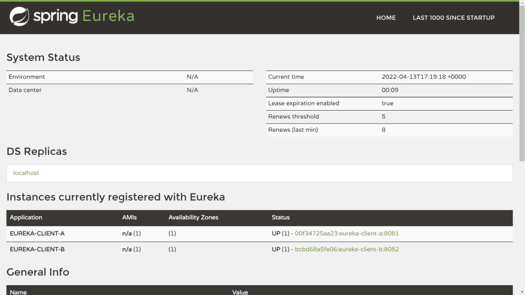 fetch-registry: falseWith just a few files, we then have a Eureka server which runs on port 8761.