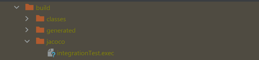 The sample project applies java and jacoco plugins, so when we run ./gradlew integrationTest Gradle produces an integrationTest.exec file.
