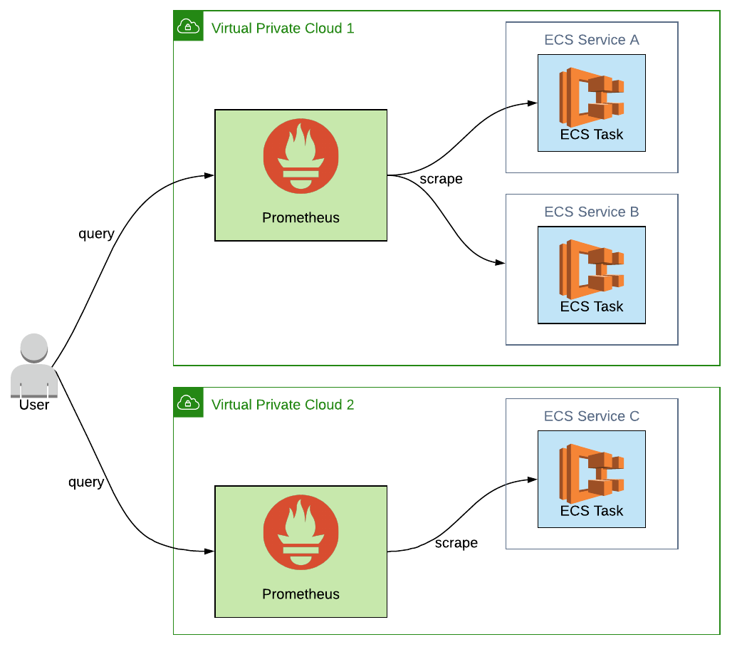 One approach to deal with ECS services in different VPCs, shown in this diagram, is to have a separate Prometheus instance per VPC. This works well, as networking between Prometheus and the individual ECS tasks is possible as they're on the same private network.