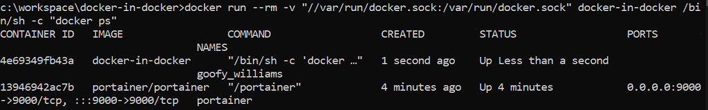 Now run it with docker run --rm -v "//var/run/docker.sock:/var/run/docker.sock" docker-in-docker-non-root /bin/sh -c "docker ps"