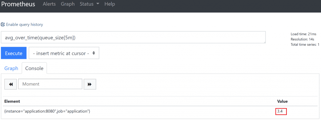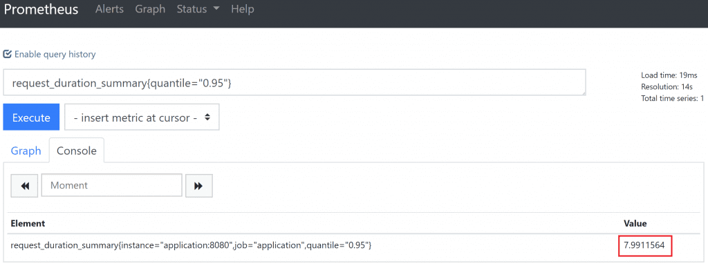 Here you can see that Prometheus is only exposing the quantiles which we have requested (0.95). With a summary, there is no way to calculate any other quantiles within Prometheus after the values have been recorded.