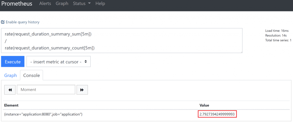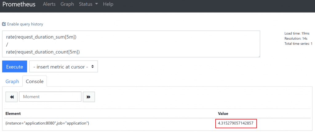We can use a similar query as we used for the histogram, to calculate the average request duration within the last 5 minutes: