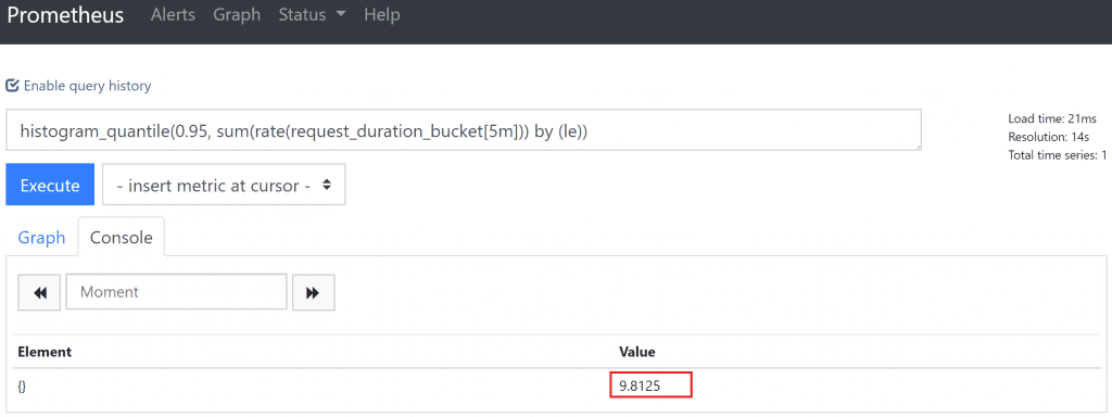 The histogram metric also allows us to calculate percentiles, which we can do using the built in histogram_quantile function. We can calculate the 95th percentile (i.e. the 0.95 quantile) in the last 5 minutes with this function: