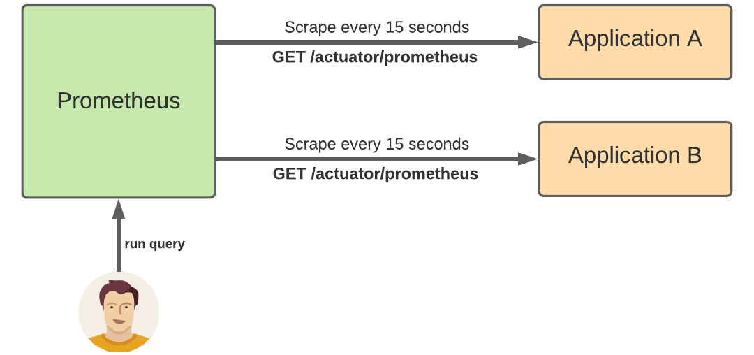 Prometheus is a standalone service which scrapes metrics from whatever applications you've configured. It's the job of the application to publish the metrics in the predefined format that Prometheus understands. We can then run queries against Prometheus to understand how our application is behaving.