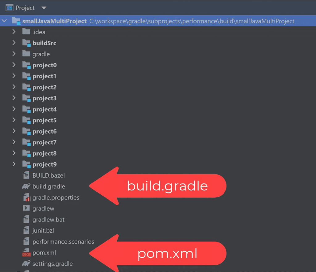 Let's be specific about what faster means, by comparing Maven and Gradle's performance in a real project. This small Java project has 10 sub-modules, each with 50 main classes and 50 test classes. 1,000 classes in total.