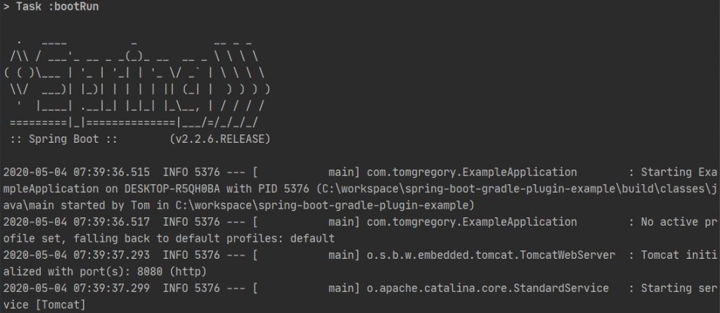 If we run ./gradlew bootRun the plugin will look for a class with a public static void main(String[] args) method. In a Spring Boot application this is typically a class which is annotated with @SpringBootApplication, which when run starts the application.