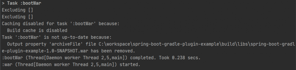 The Spring Boot Gradle plugin reacts to this plugin by creating the bootWar task, which generates an executable fat war file similar to the jar.