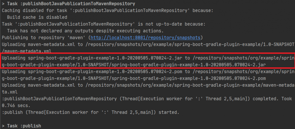 Eventually once you're happy with your jar or war file, you'll want to publish it. The maven-publish plugin allows you to publish Gradle built artifacts to a Maven repository.